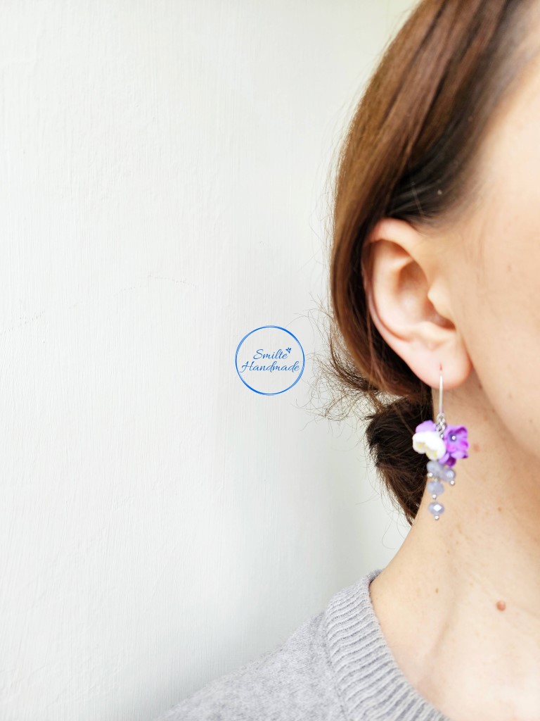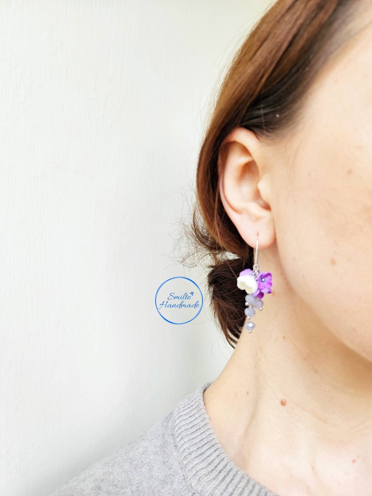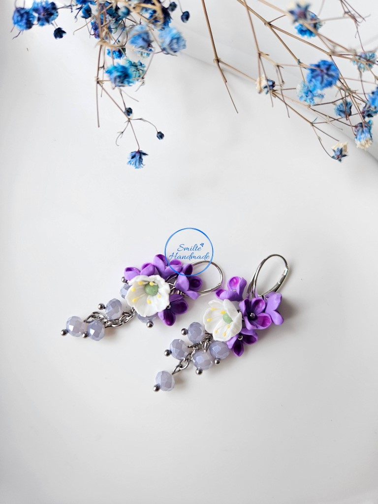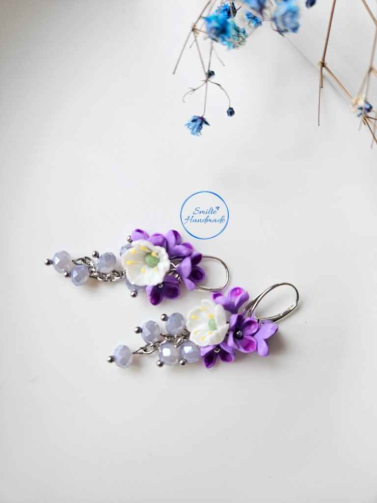 Elegantiški, estetiški rankų darbo auskarai. Auskarai labai lengvi, visiškai nejaučiami ausyje. Alyvų ir obels žiedų derinys suteikia auskarams puošnumo ir pavasariško gaivumo.