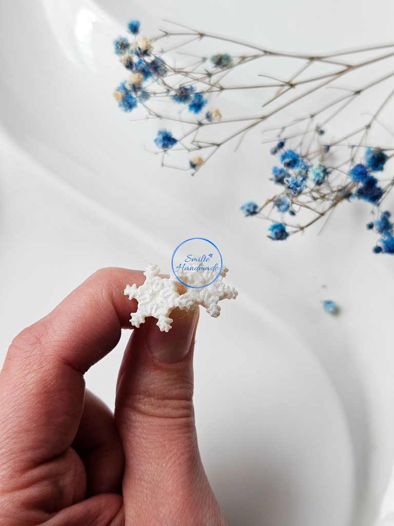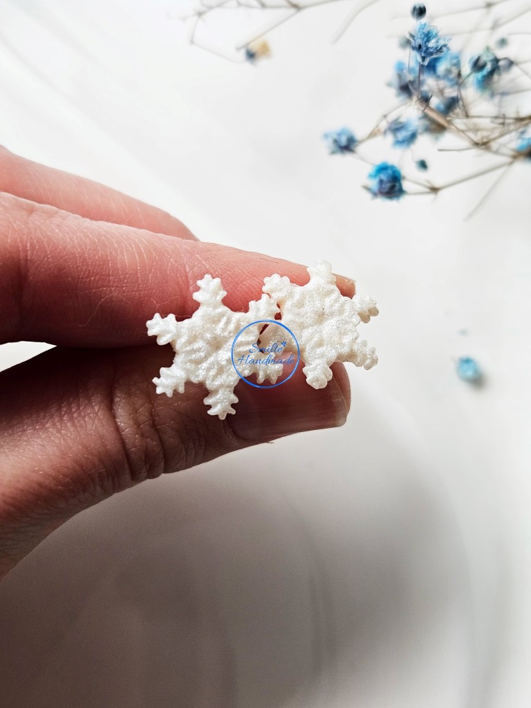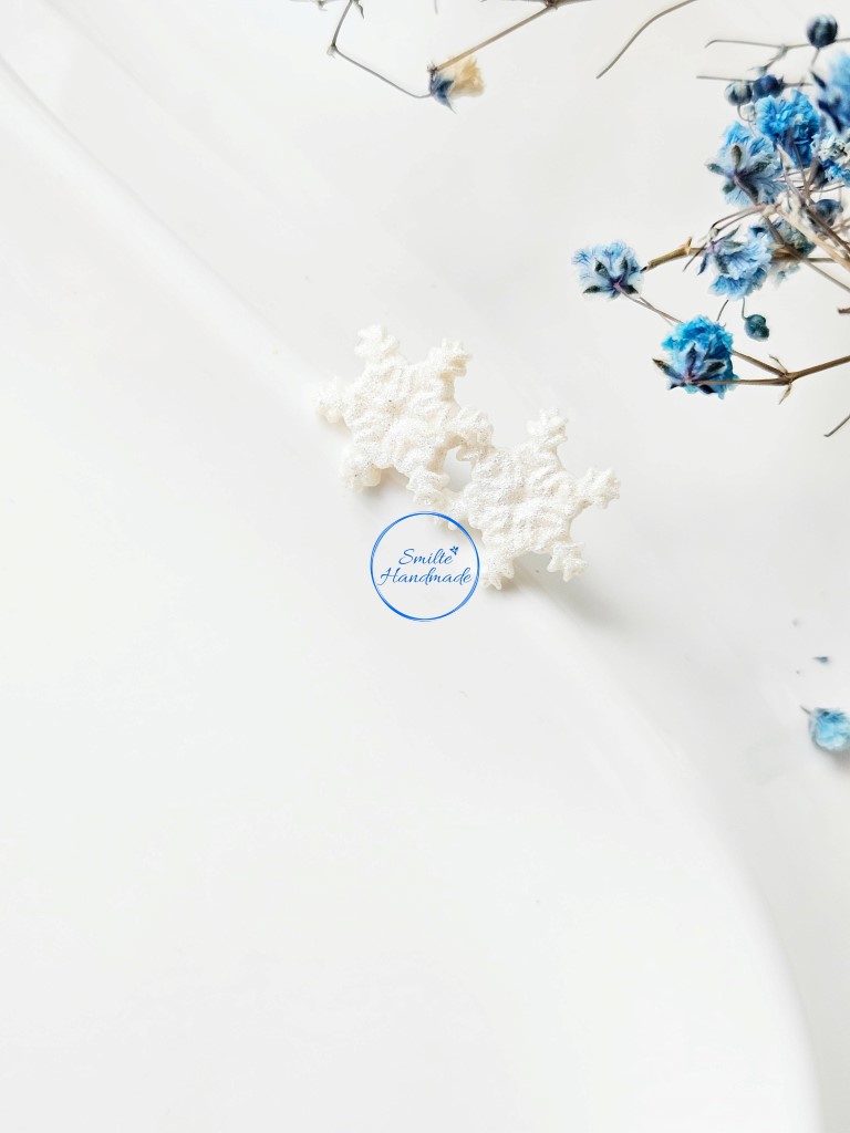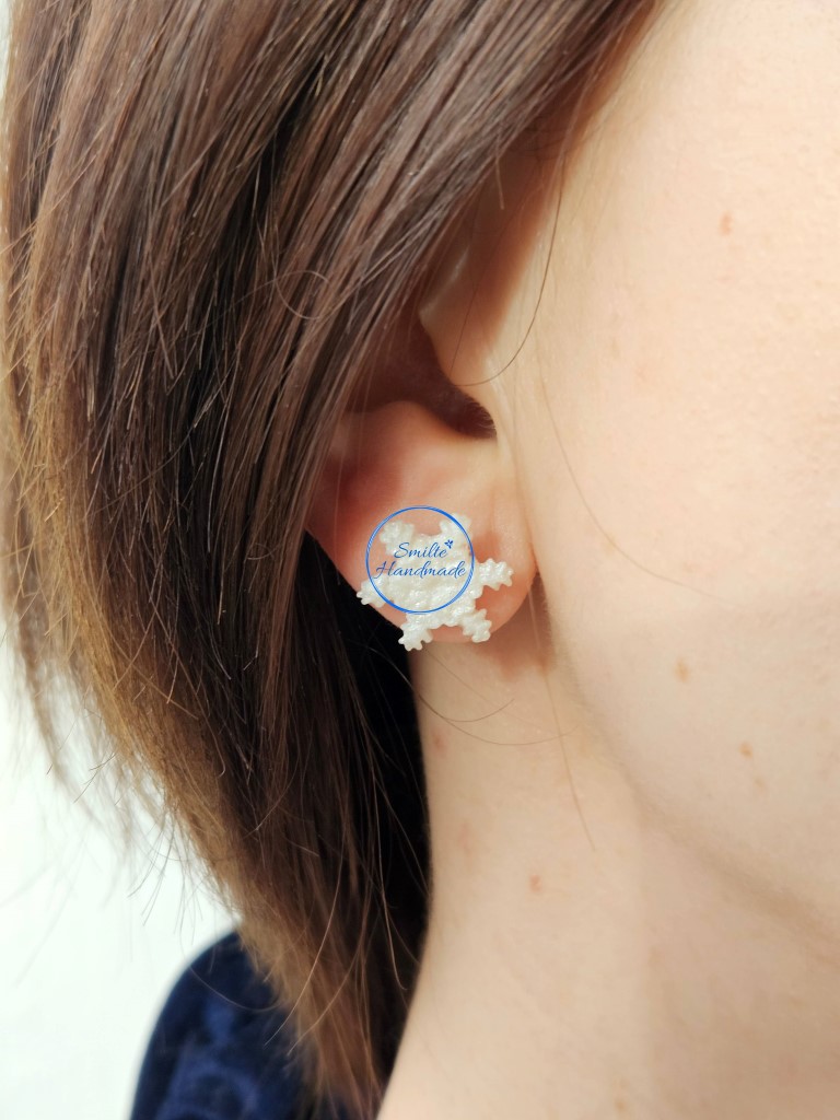 Puošniai atrodantys, rankų darbo auskarai snaigės. Auskarai yra baltos spalvos su sidabro žėručiu. Auskarų blizgesys išryškėja dirbtinėje arba saulės šviesoje. Tinkami puoštis kiekvieną dieną. Visiškai nejaučiami ausyje, pamiršite, kad esate įsivėrusi auskarus.