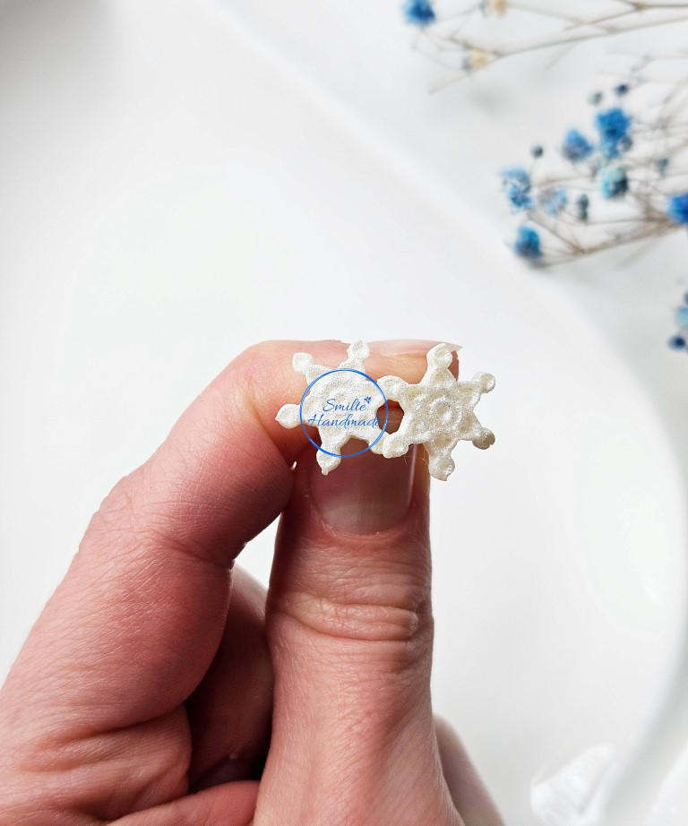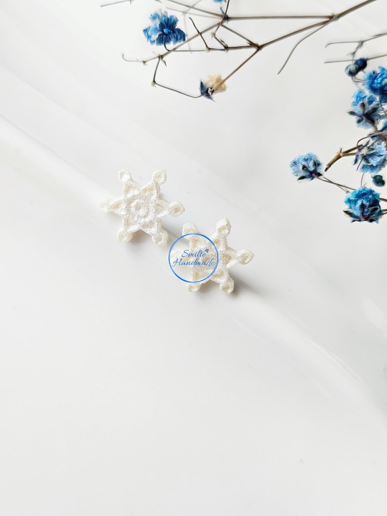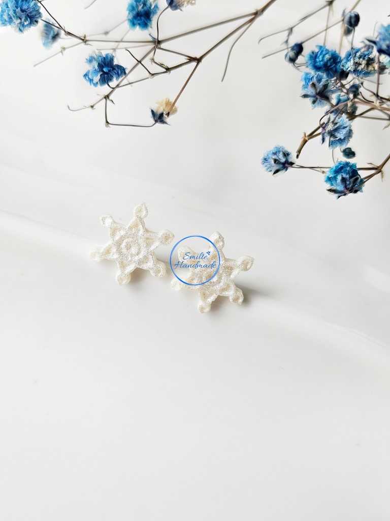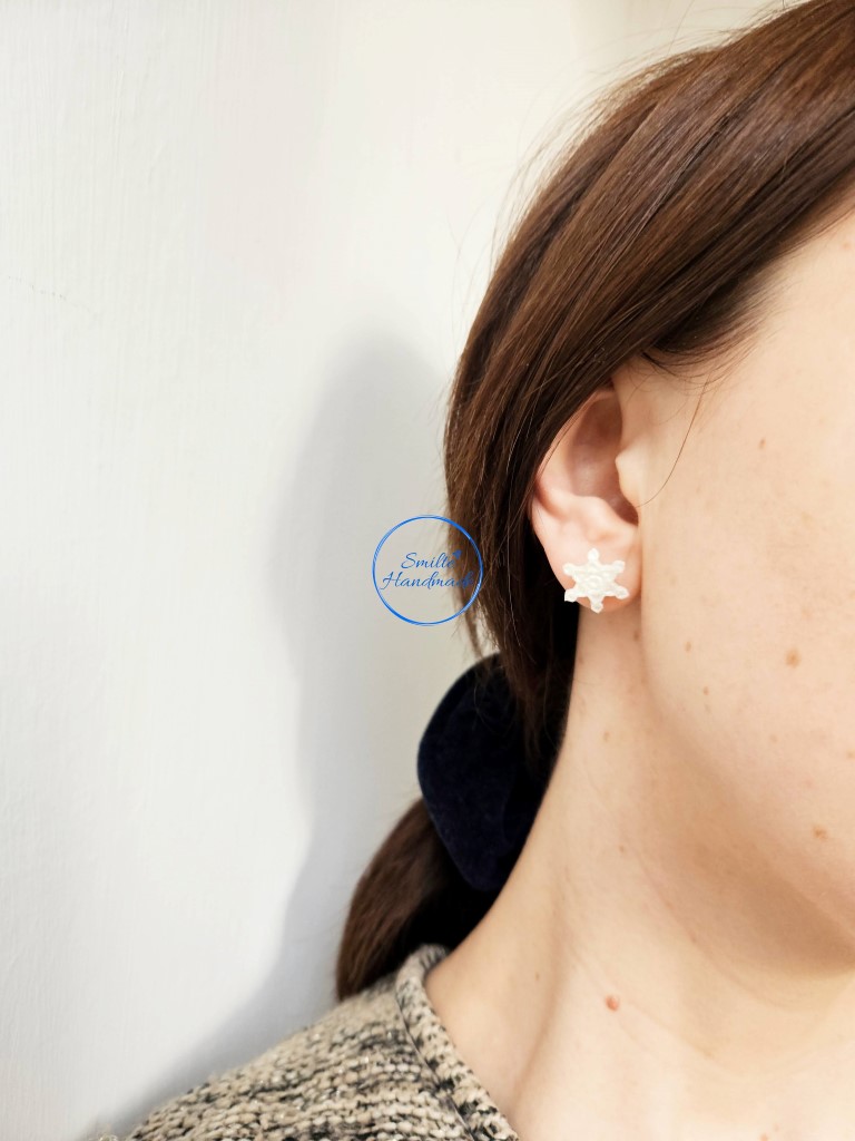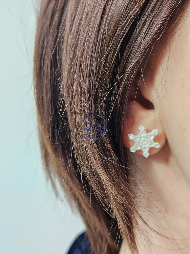 Puošniai atrodantys, rankų darbo auskarai snaigės. Auskarai yra baltos spalvos su sidabro žėručiu. Auskarų blizgesys išryškėja dirbtinėje arba saulės šviesoje.  Tinkami puoštis kiekvieną dieną. Visiškai nejaučiami ausyje, pamiršite, kad esate įsivėrusi auskarus.