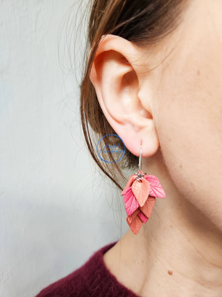 Originalaus dizaino, rankų darbo, labai lengvi auskarai su lapeliais. Auskarai visiškai nejaučiami ausyje. Rudeniškų rusvų atspalvių derinys atrodo harmoningai, auskarai lengvai derinami prie įvairios aprangos. Lapeliai yra su subtiliu žėručiu, kuris išryškėja salėje arba dirbtiniame apšvietime. Lapeliai pagaminti iš polimerinio molio. Metalas nerūdijantis plienas. Auskarų užsegimas angliškas (sidabro).