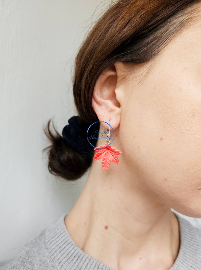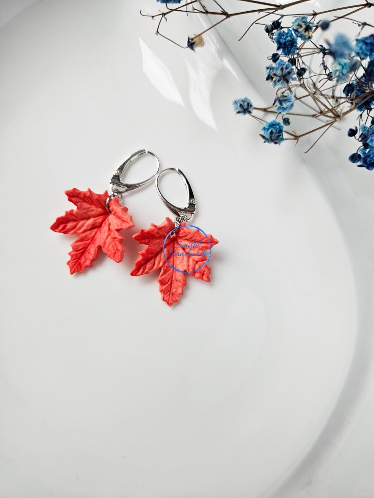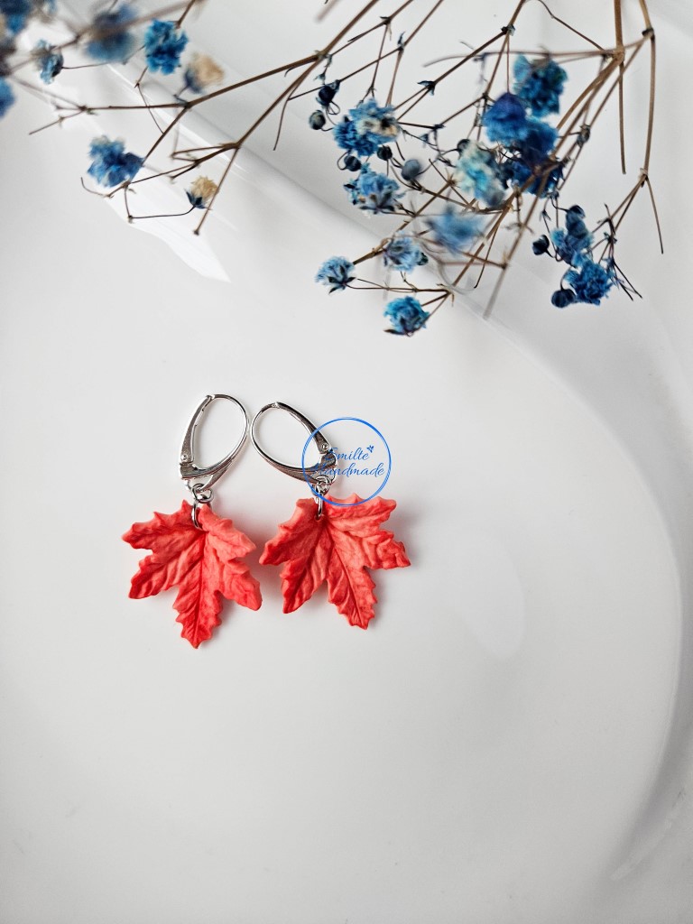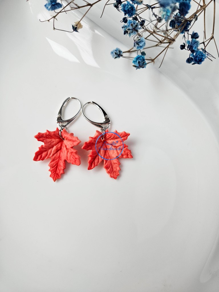 Rankų darbo, kabantys auskarai su klevo lapais. Auskarai