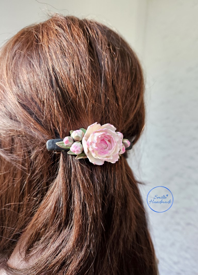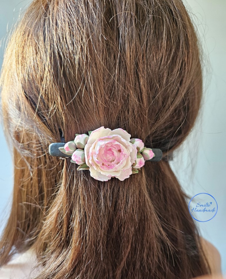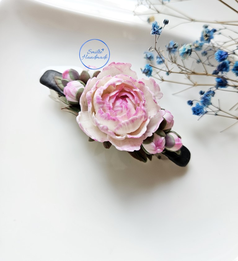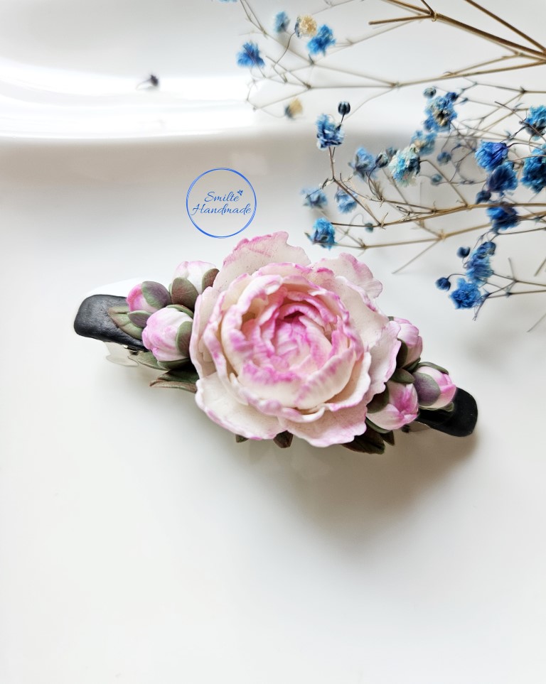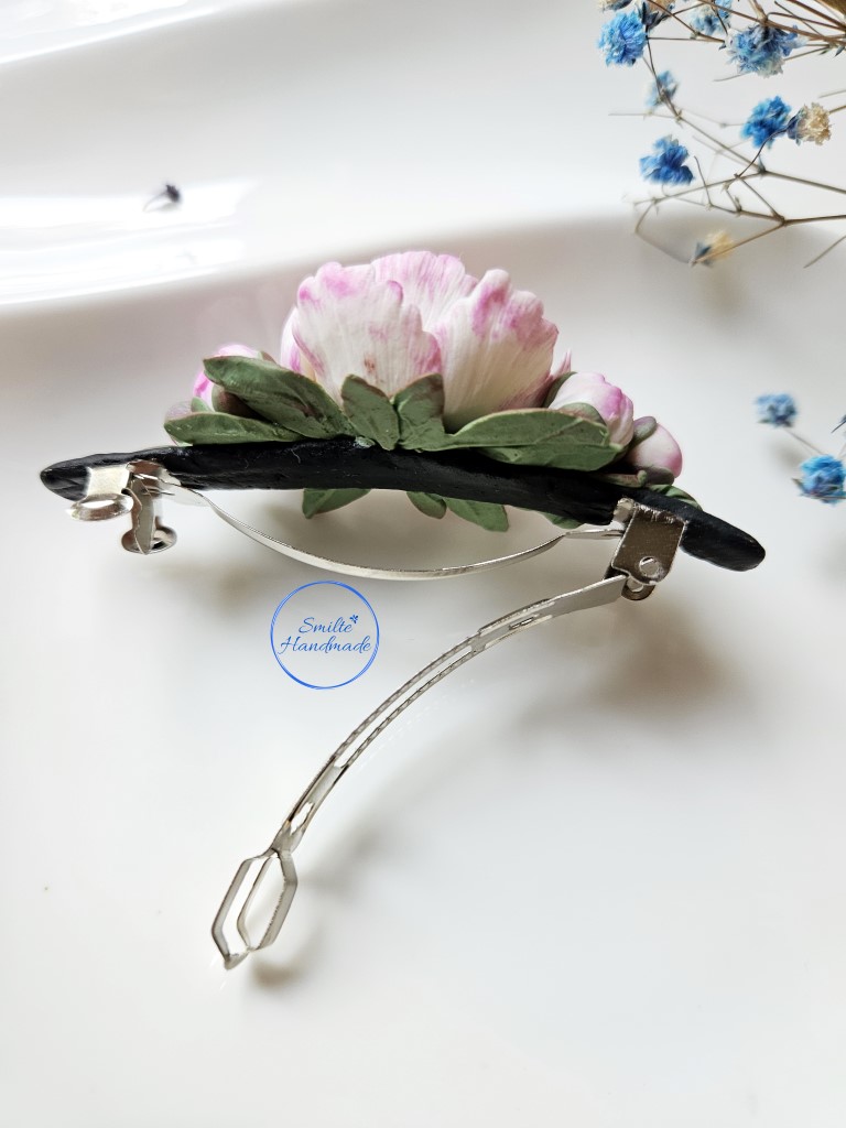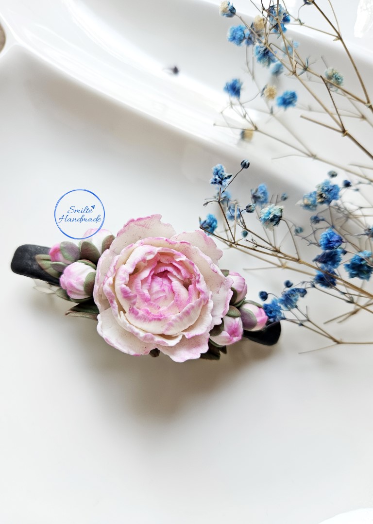 Jei norite savo kasdieninei plaukų šukuosenai suteikti puošnumo ir romantiškumo. Ši rankų darbo plaukų segė su bijūnais puikus pasirinkimas. Segė neslysta, tvirtai laikosi įsegta. Segės viduje esantis mechanizmas išsilenkia ir prisitaiko prie Jūsų plauko. Visos detalės pagamintos iš polimerinio molio. Kiekvienas bijūno lapelis gamintas rankomis. Segės pagrindas pagamintas iš odos imitacijos polimerinio molio. Segės metalinis pagrindas - nerūdijančio plieno.