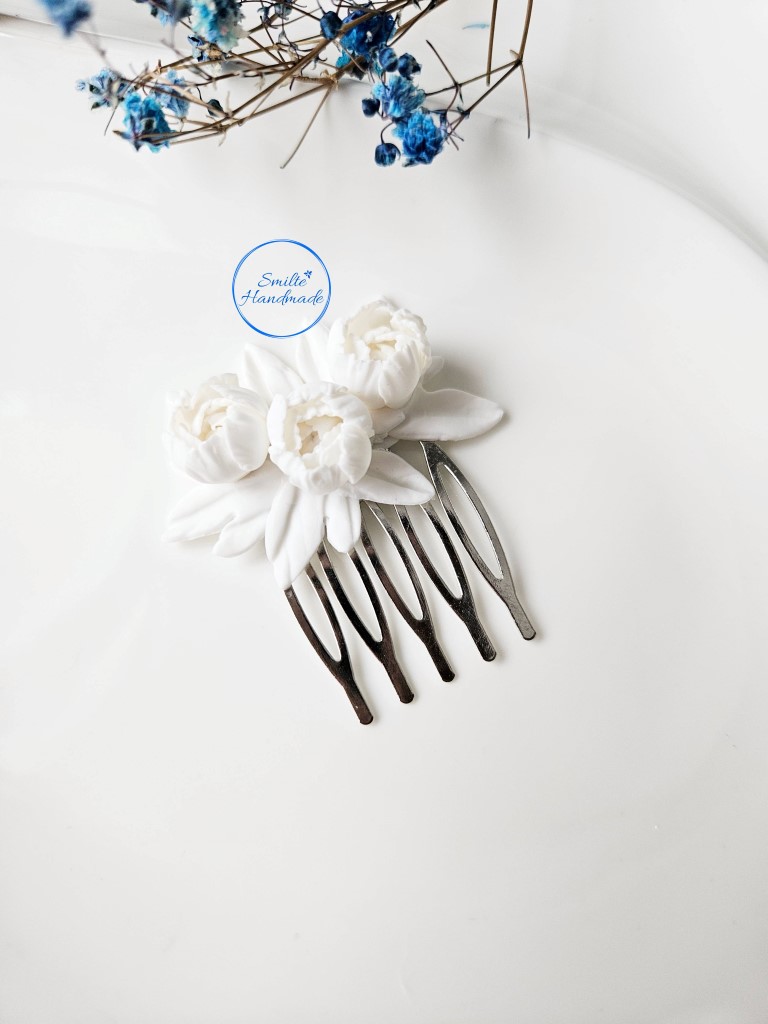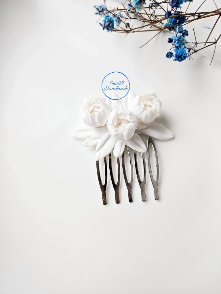 Plaukų papuošalas yra rankų darbo, bijūnai ir lapeliai pagaminti iš baltos spalvos polimerinio molio. Šukos yra bižuterinis metalas.